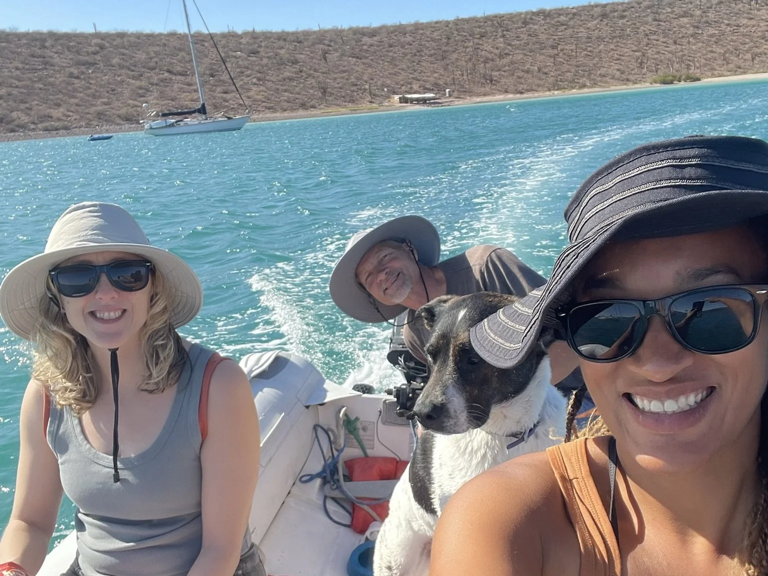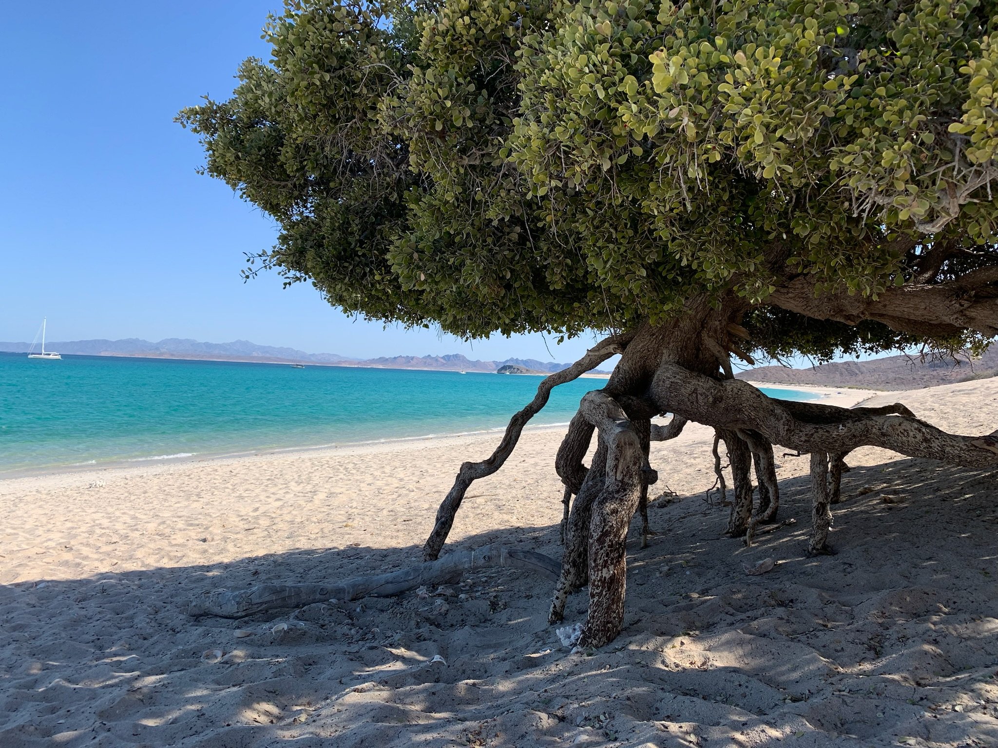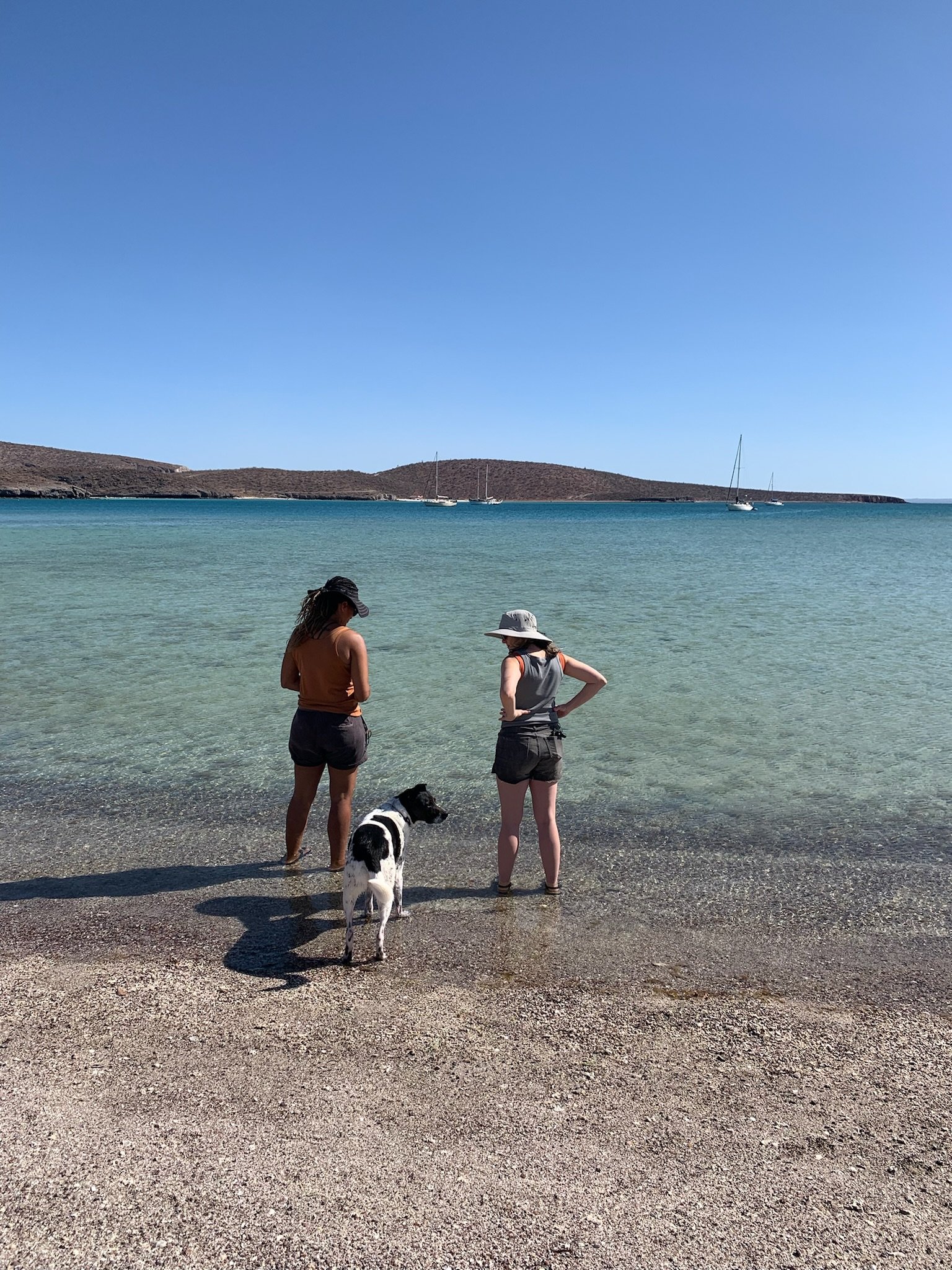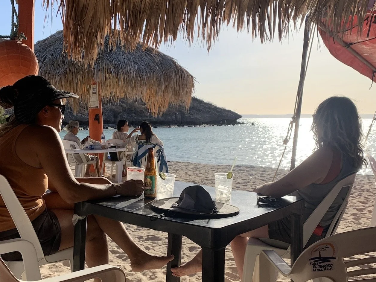 La Paz was more laid-back than Cabo, and we spent two weeks there, devouring delicious tacos, people-watching on the Malecon, and taking advantage of the huge grocery store to load up on provisions. Dolphins circled in the anchorage daily, keeping Desi running in excited circles around the deck. The highlight was a visit from our friend Sabrina, who spent a long weekend aboard, sailing with us to the nearby island of Espiritu Santo to spend an afternoon on the beautiful white sand beach, admiring shells and wading in the clear turquoise water. Our departure from the island the next day was a bit rushed, as bees began to swarm us by the hundreds, in search of fresh water. We sailed back toward La Paz, stopping to anchor for a night in Bahía Falsa, where we snorkeled a small reef and enjoyed cocktails at a little palapa restaurant on the beach.