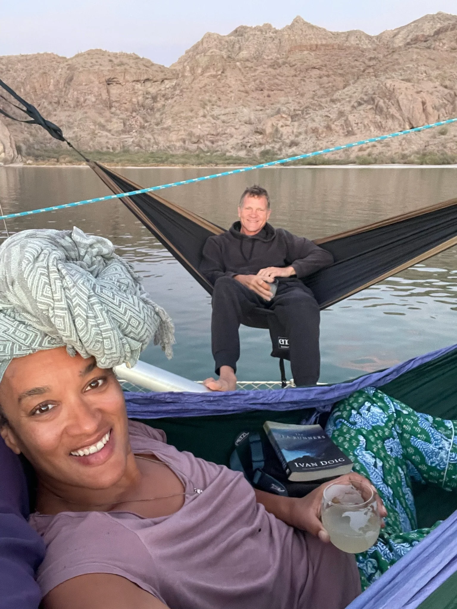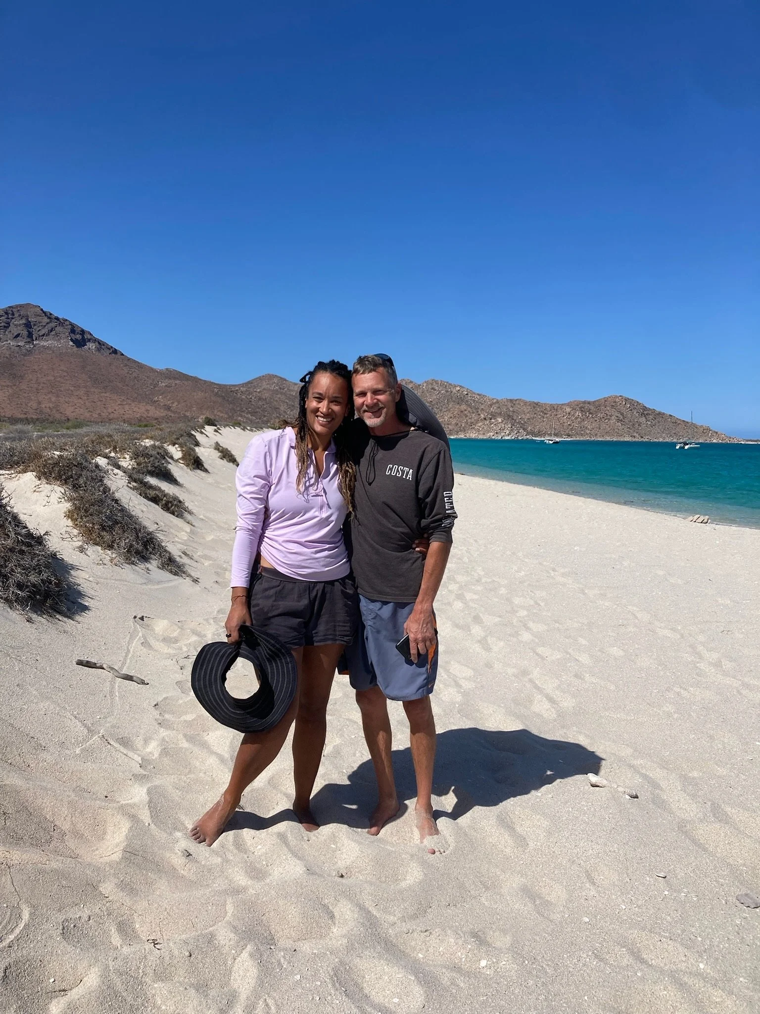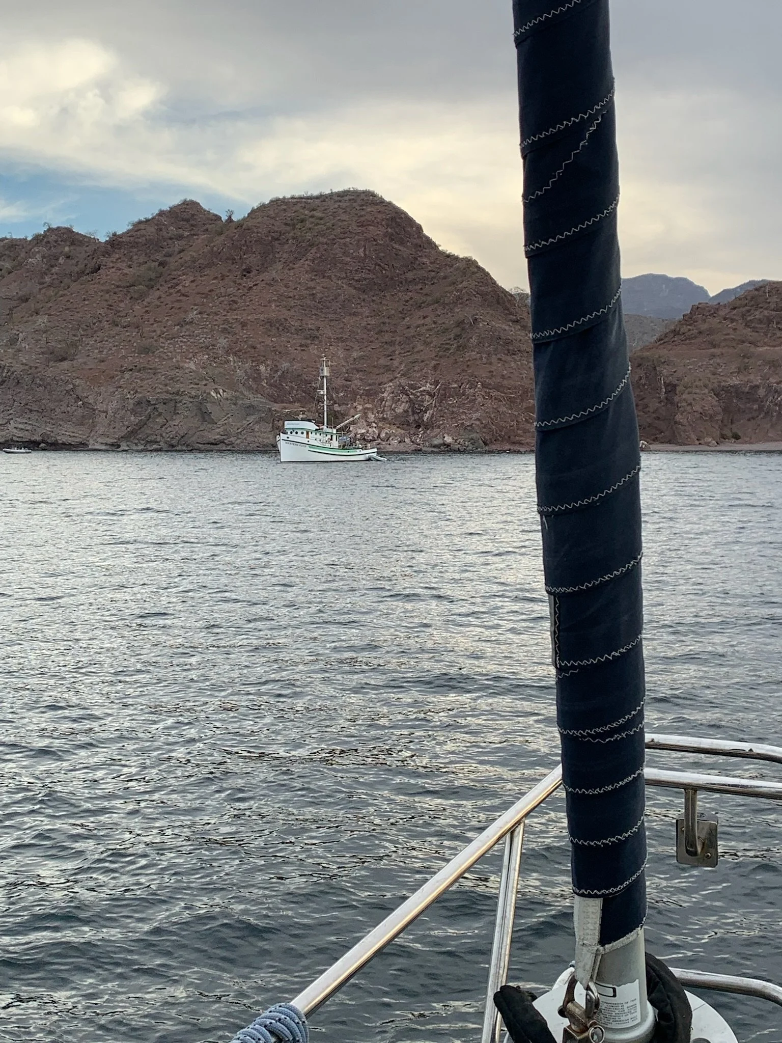 Continuing north up the Baja peninsula, we sailed for five hours to Bahía Agua Verde. I worked along the way while Karl sailed the boat. He had a unique surprise when, after fighting to reel in a fish, the resistance suddenly abated, and he reeled in only a severed fish head. Something large had beat him to it! We arrived in Agua Verde just before sunset and anchored in a small cove on the south side of the main bay. We had prepared for several weeks in remote areas, with cupboards fully stocked, propane filled, and a careful trash storage plan to minimize smell and bugs. Though still quite remote, Agua Verde was our first inhabited location since La Paz, and it was a luxury to dispose of trash, enjoy fish tacos on the beach, and pick up a few produce items at a little tienda (store) up the road. We met a few other cruisers, did a short hike to an overlook of the Bay, and attended an event on the beach celebrating the visitation of the Western Flyer, a fishing boat famous for its 1940 expedition described in John Steinbeck’s book The Log from the Sea of Cortez.