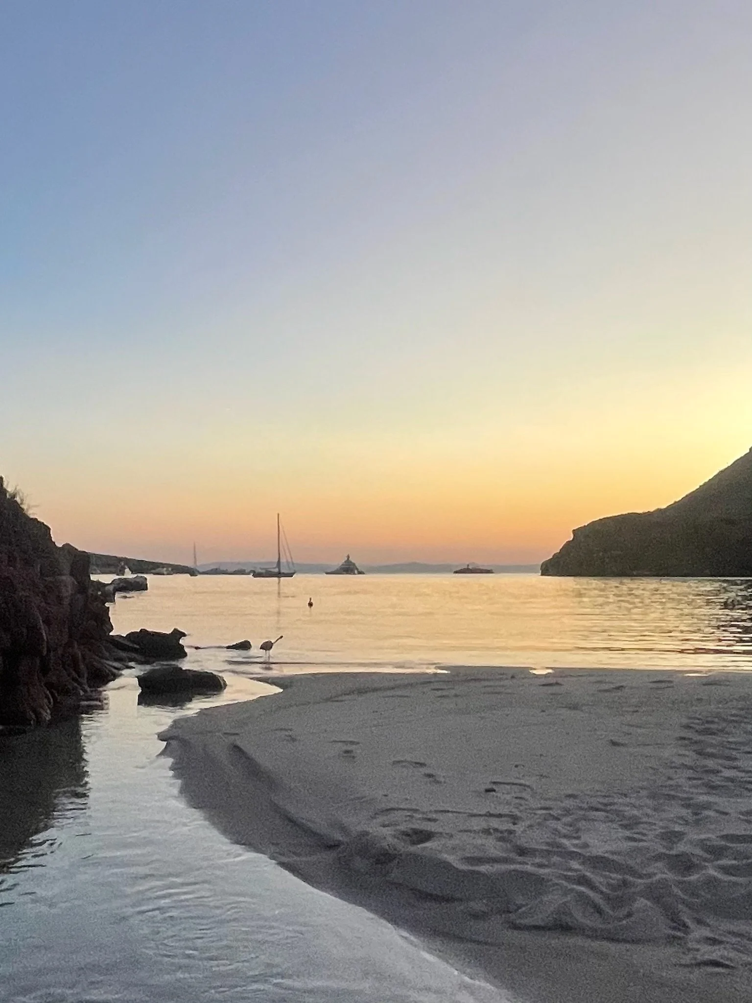 After Sabrina’s visit, we prepared to head north up the Gulf of California (aka the Sea of Cortez), a stretch known for its beautiful anchorages, plentiful enough that long overnight passages would be unnecessary for months to come. Our first stop was Ensenada Grande anchorage on Isla Partida, a small island just north of Espiritu Santo, and a six-hour sail from La Paz. We were surprised to find the anchorage quite busy, with three mega yachts and their entourages, as well as dozens of smaller boats. We found a spot near a small beach to drop the hook, and I snorkeled to shore while Karl took the paddleboard. As I swam, beneath me I saw dozens of snaking trails ending in indentations in the sand, where sting rays had buried themselves. We heeded the advice to shuffle our feet in the water, to avoid stepping on one and causing a defensive strike. The sun was setting, and the small beach was quiet. We ran into a fellow cruiser we had met years ago in Astoria, as we headed north to the San Juan Islands, and he and his wife headed south to begin their cruising adventure. Now, years later, they had spent many seasons in the area, and he shared favorite spots and tips with us. It was dark by the time we paddled back to Otaria, surrounded by anchor lights like bobbing stars throughout the bay.