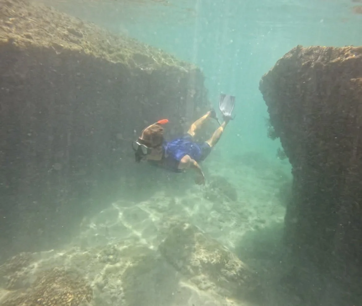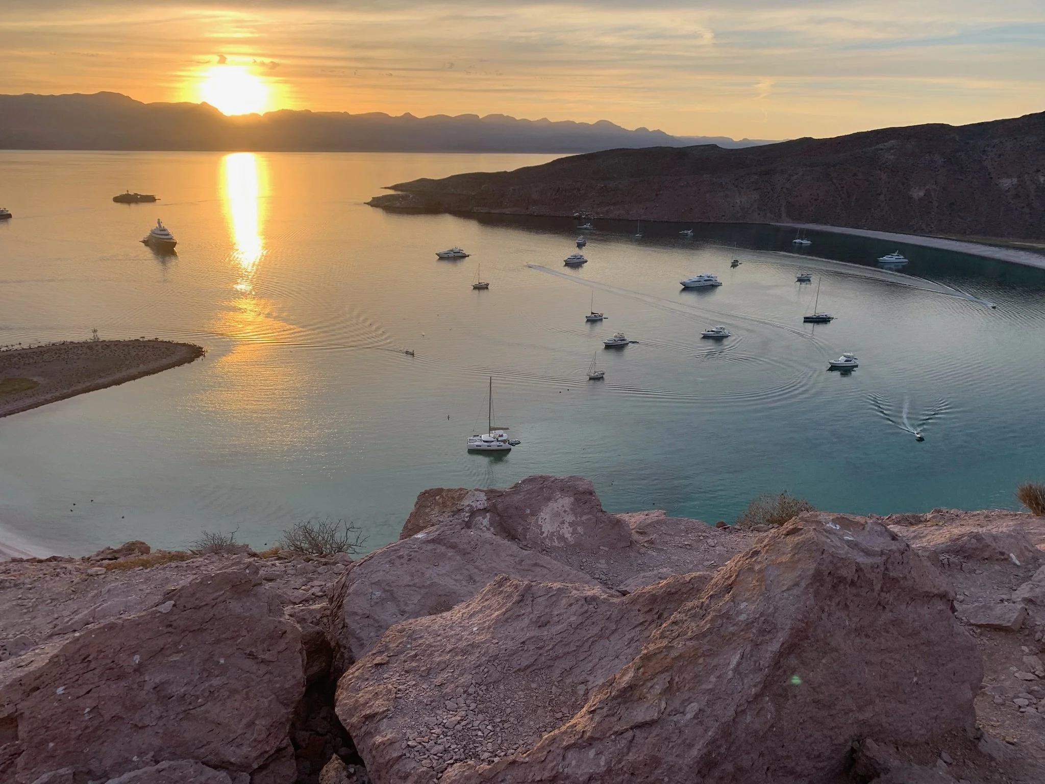 The next morning, we snorkeled along the beautiful rock formations at the edge of the bay, blown away by the colorful fish and plant life. Back onboard in the afternoon, we discovered a failure of the windlass solenoid and had to haul the anchor up by hand before departing the bay. We sailed for four hours, north to Isla San Francisco, a small island where we found a spot among a dozen or more boats in the large crescent-shaped bay. Over the next three days, we rowed to shore in the evenings after work, weaved through salt flats, hiked the rocky hills surrounding the bay, and watched the pelicans dive around us, silhouetted against vibrant sunsets. The island was beautiful, but the charter boats and mega yachts were loud, and after several weeks in busy anchorages, we were feeling ready for a more secluded spot.