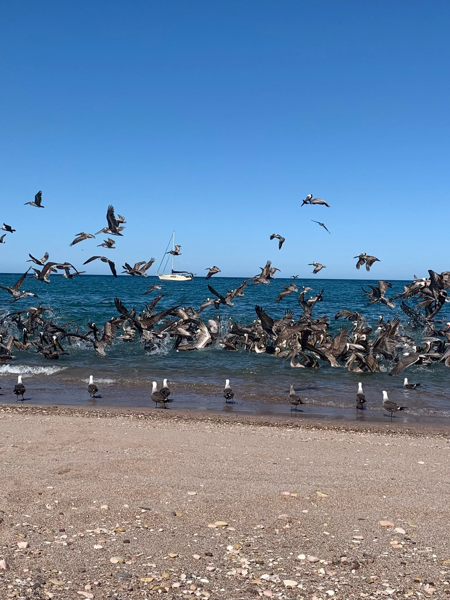 The sail to Los Gatos was a rowdy one, with head-on winds that hit as soon as we cleared Isla San Jose, and seas that continued to build in height. After six hours, we were relieved to find enough space to tuck into Los Gatos anchorage with three other boats. The next day was Easter Sunday, the other boats all departed, and we had the place to ourselves for the next two days. The nearby hikes had amazing views, we found great snorkeling on a nearby reef, and with no one in sight, clothing was optional. We spent hours watching hundreds of pelicans diving as if raining from the sky, and I got a shock when Karl unknowingly startled a bobcat, and it shot from among the rocks out across the beach. A couple of pangas came by the boat to sell us fish and lobster, an unexpected treat in the uninhabited area.